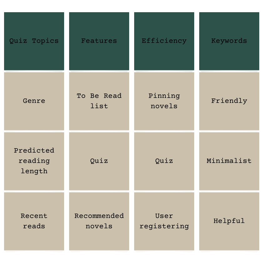 I used affinity mapping to not only map out the general theme of myTBR, but it also helped me identify my main focal points in building the app. The findings I found in this phase helped me identify the path I needed to take for this project.